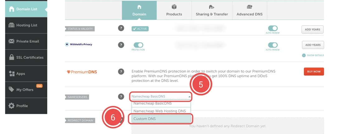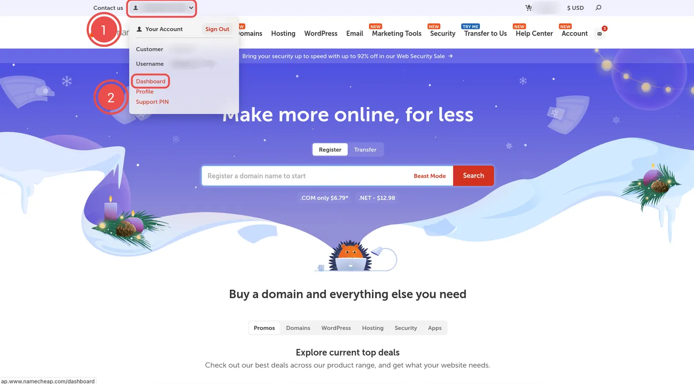 - Log back in to namecheap. Hover over the profile dropdown on the top left of the page.