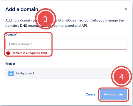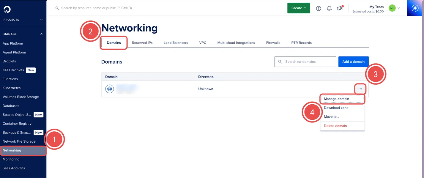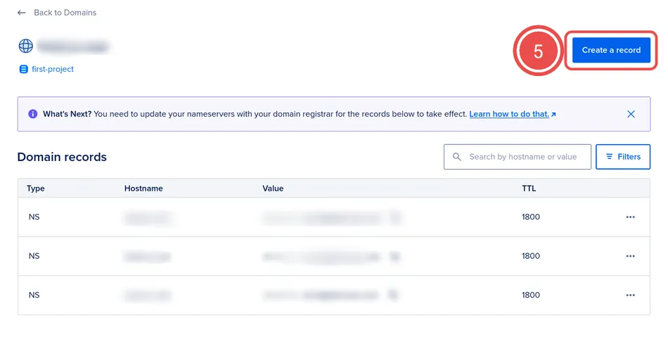DOMAIN.TLD. - Click "Add domain". Once done, the Networking page will be displayed. Name servers for the domain will be present under the "Value" column.