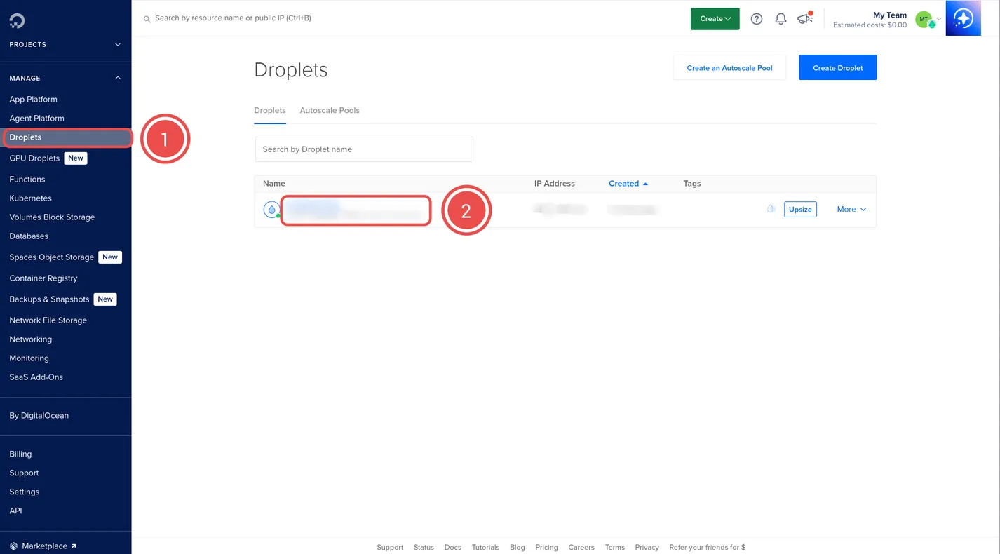 - Select a Droplet: Choose the VPS you created in the previous step.