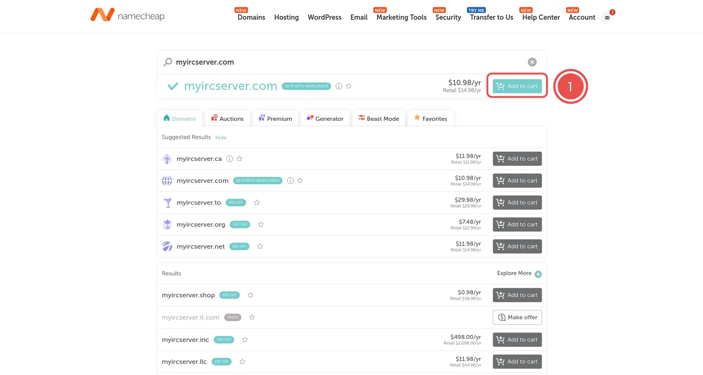 After making an account on namecheap, use the search bar in the center to check the availability of the domain name you want to use for the IRC server. The domain name doesn't need to be pretty. It may be tempting to get a funny or cute TLD (That's the .com or .org or .net after the name of the site), but don't spend extra on it.
