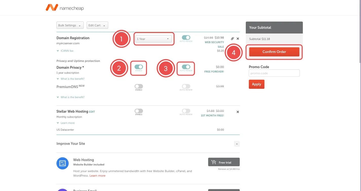 Once the item is added to your cart, namecheap will offer a number of "recommended" products. Don't worry about those.
