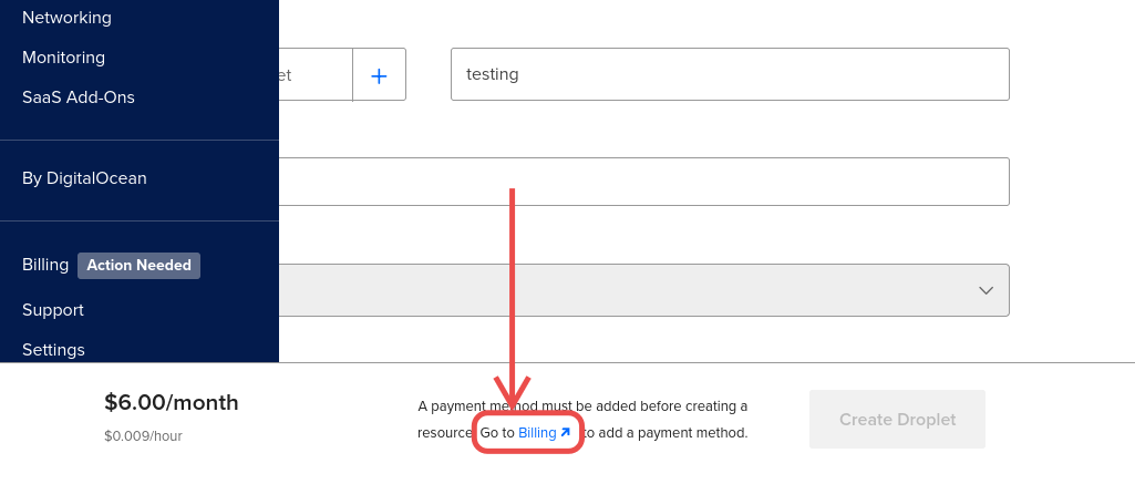 You have to add a payment method before you can finish creating your VPS. A "Billing" popup should appear. Open it in a new tab and fill it out. You can return to this tab when done and finalize.