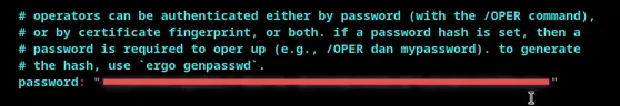 You should now be connected to your server as a registered user, and can activate admin priveleges by typing /OPER admin password. Replacing password with the un-hashed version of the password that was created earlier using ./ergo genpasswd. Activating admin priveleges will be referred to as "OPER mode" from here forward.